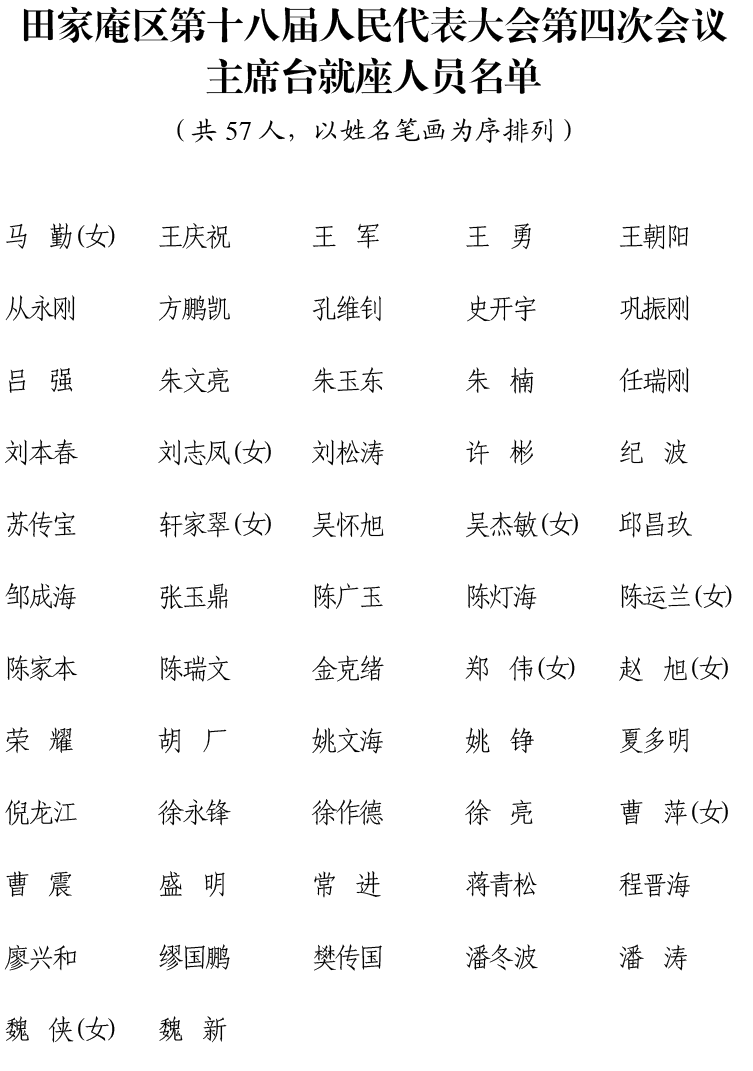 田家庵区第十八届人民代表大会第四次会议主席台就座人员名单