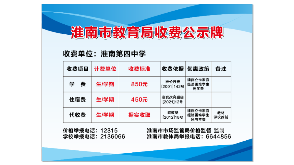 【教育教学领域】淮南四中学校收费公示