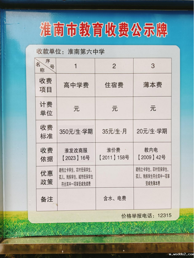 【教育教学领域】2023年淮南第六中学收费公示牌